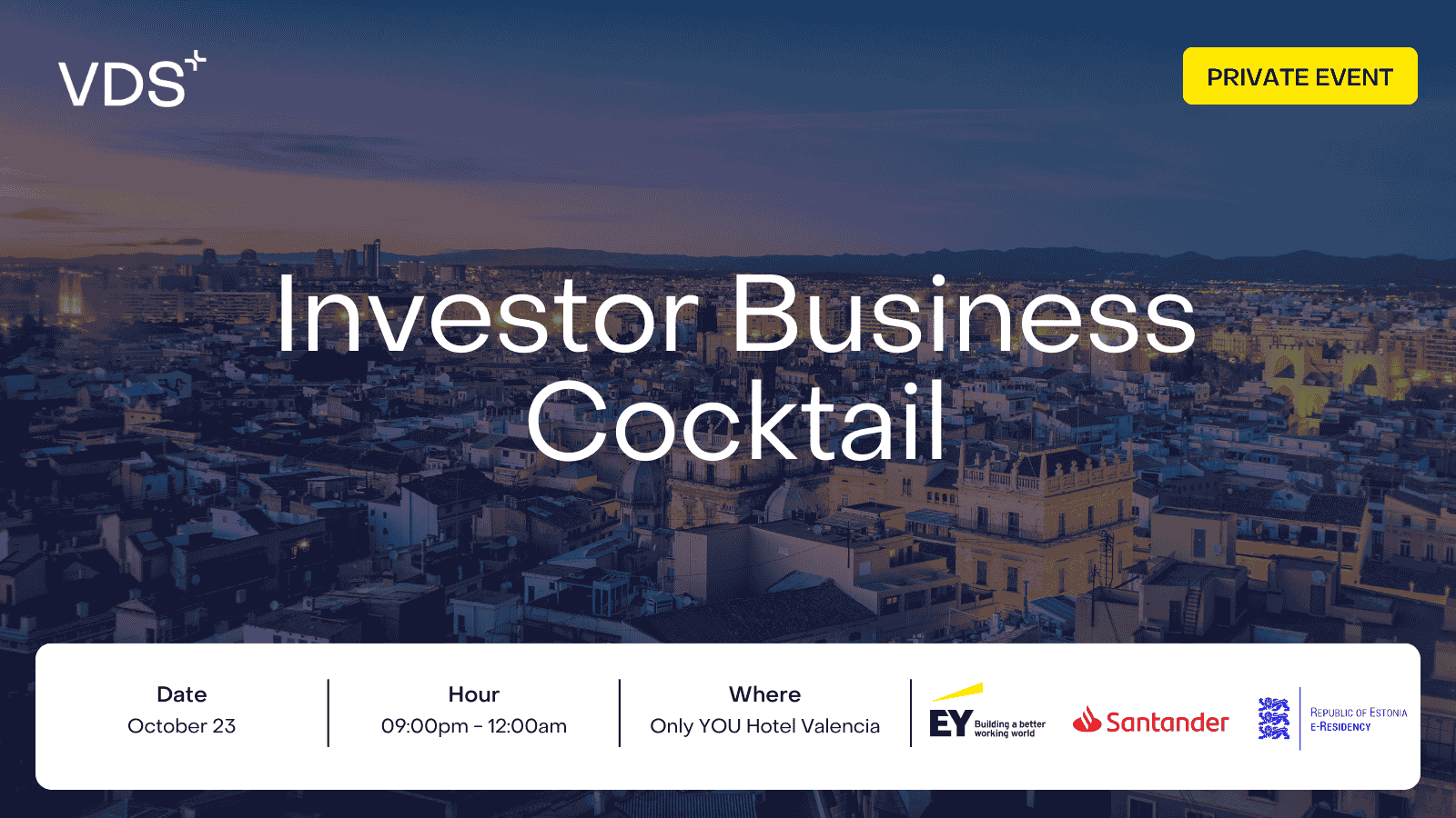 Join us for the Investor Business Cocktail on the stunning terrace of the Only YOU Hotel Valencia, featuring breathtaking nighttime views of the city. This exclusive event, hosted by EY, Santander, and E-Residency as part of VDS, will take place on October 23rd at 9:00 PM. Network with international thought leaders and key LPs in a relaxed, elegant setting. Don’t miss this unique opportunity to connect and enjoy an unforgettable evening.